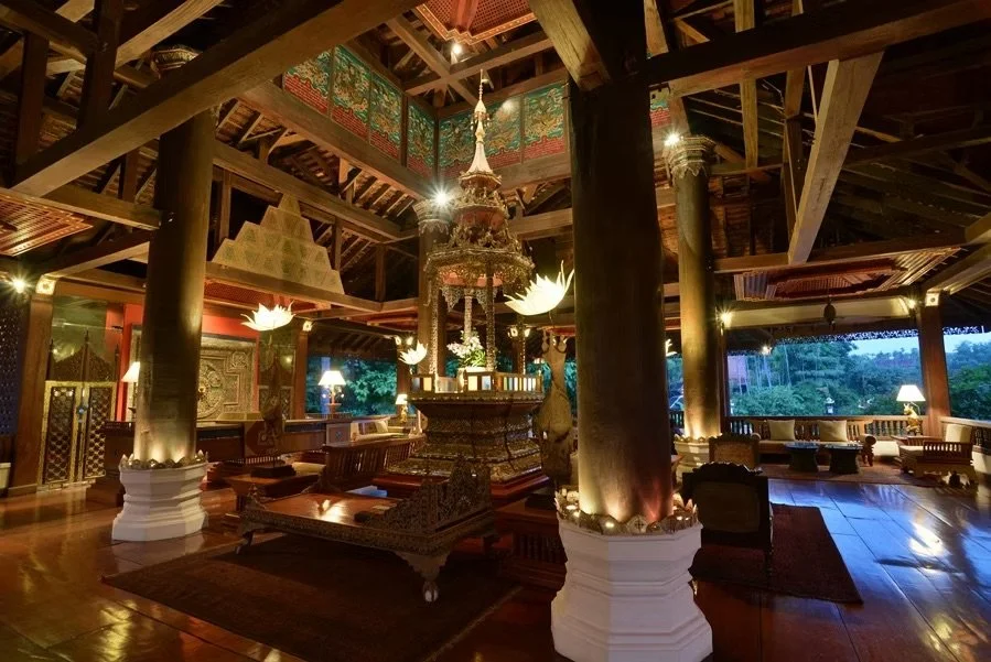 Located only 10 minutes outside Chang Mai’s center, Dhara Dhevi is very accessible yet offers a peaceful retreat from the thrilling and dense city-scape. Marked by a massive manicured setting, ornate gateways lead you through a formal linear procession to the striking entry and grandeur of the Dhara Dhevi. Surrounded by 60 acres of immaculately maintained tropical vegetation, the traditional architecture is most impressive as it intricately mirrors the sacred presence of a genuine Thai palace. With a time-honored aesthetic highlighted by classic details and delicate finishes executed in astonishing accuracy, one would be surprised to learn that the resort was constructed only 11 years ago. The interior, just as expansive as the exterior, features lofty wooden coffered ceilings and is expertly composed of museum-like furnishings radiating comfort and luxury.
