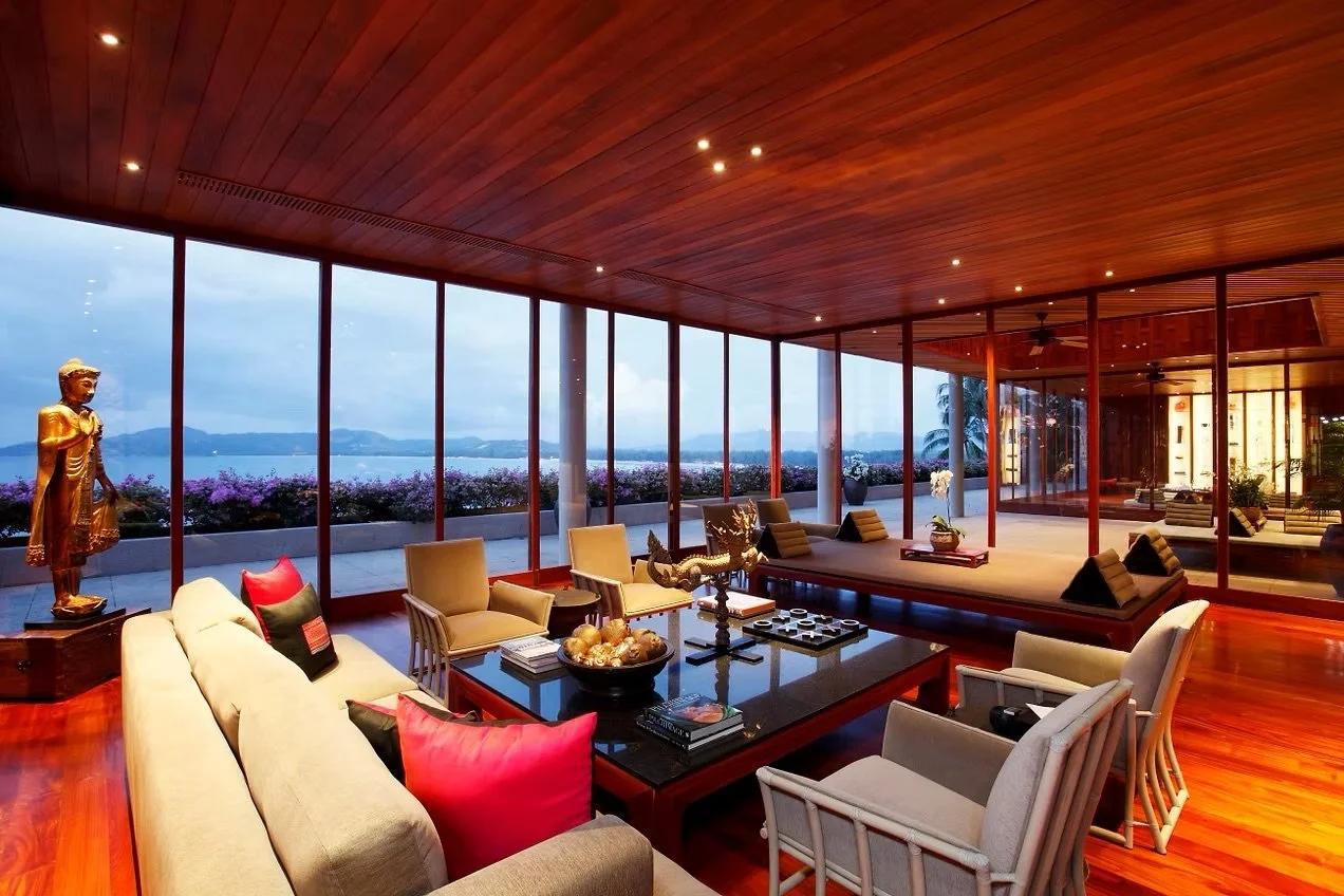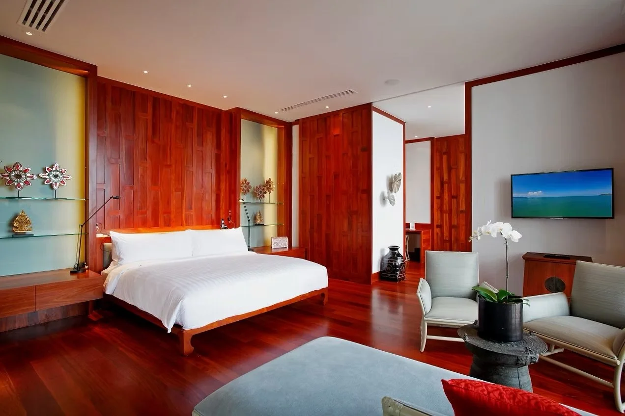 Highly recommended for large families or groups traveling together, are the newly constructed grand villas. You can choose a private villa with up to 9 bedrooms. To make optimal use of the hilly landscape, the residences are comprised of several floors and feature an interior elevator for easy access and spatial fluidity. The rooms are immaculately furnished with an intriguing balance of contemporary aesthetic alongside an array of traditional artistic motifs and ancient statues to embrace the prominent cultural presence. The composition of all the intricate details, textures, and decorative elements are very well planned and perfectly executed into a flawless fusion of design. Full-height operable partition-walls promote an open floor plan and easily enlarge adjoining spaces. The bedrooms are massive and complemented by equally enormous bathrooms, which are flanked by “his” and “hers” dressing rooms to either side. Steps away is your very own infinity-edge pool situated for remarkable views that overlook the beautiful Andaman Sea and beyond to the profound horizon that beautifully cradles the sun at dusk and dawn. Honestly, there is virtually no need to leave the premises since it’s very much like staying in your own hotel. Nothing has been spared to build these pristine villas that are radiantly gorgeous during the day and sparkle with chic elegance at night.